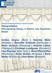 Neben den Vortragenden unseres Lehrstuhls, Rene Pfeilschifter, Maria Janosch und René Walter, erörtern viele weitere renommierte Gäste spannende Fragen rund um das Thema Self-organizing Groups in Rome’s Late Republican Empire.