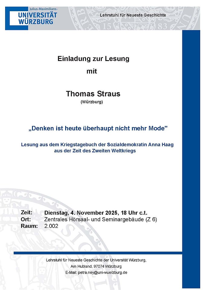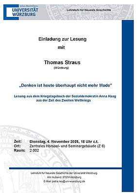 Thomas Straus (Würzburg): „Denken ist heute nicht mehr Mode". Lesung aus dem Kriegstagebuch von Anna Haag